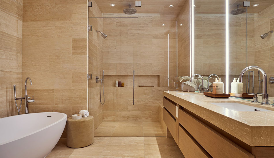 - Master bathroom features Italian classic travertine stone flooring, walls, and countertops, with chrome Dombracht fixtires and Toto Legato toilet