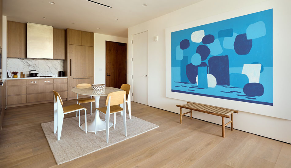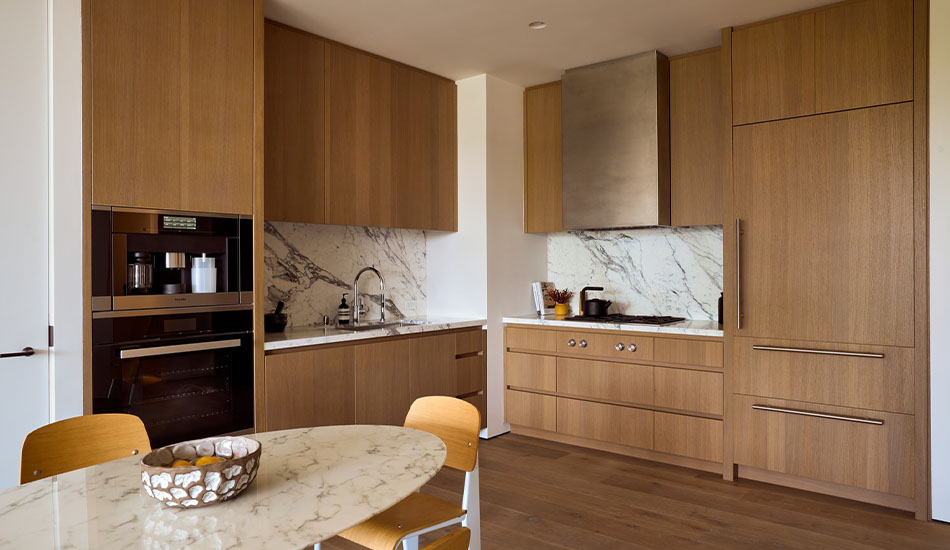 - Custom-designed chef’s kitchen with white oak cabinetry, Italian Calacatta goldmarble, and custom soft-brushed stainless steel hood